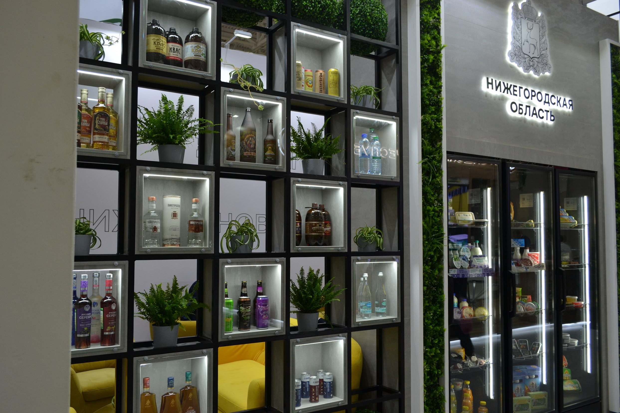 На стенде Нижегородской области представлены мясная и колбасная продукция, хлебобулочные изделия, сыры, молочная продукция, майонезы и соусы, рыбная продукция, соленья, кондитерские изделия, напитки и пр.